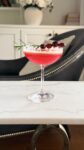 Cranberry orange whiskey sour in a coupe glass with cranberries on rosemary sprig from the side.