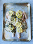 Greek seasoning and lemons on a spatchcocked chicken on a sheet pan