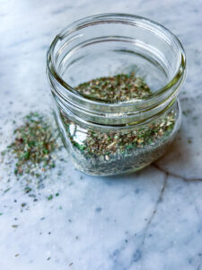 Greek spices in a jar with some on the counter