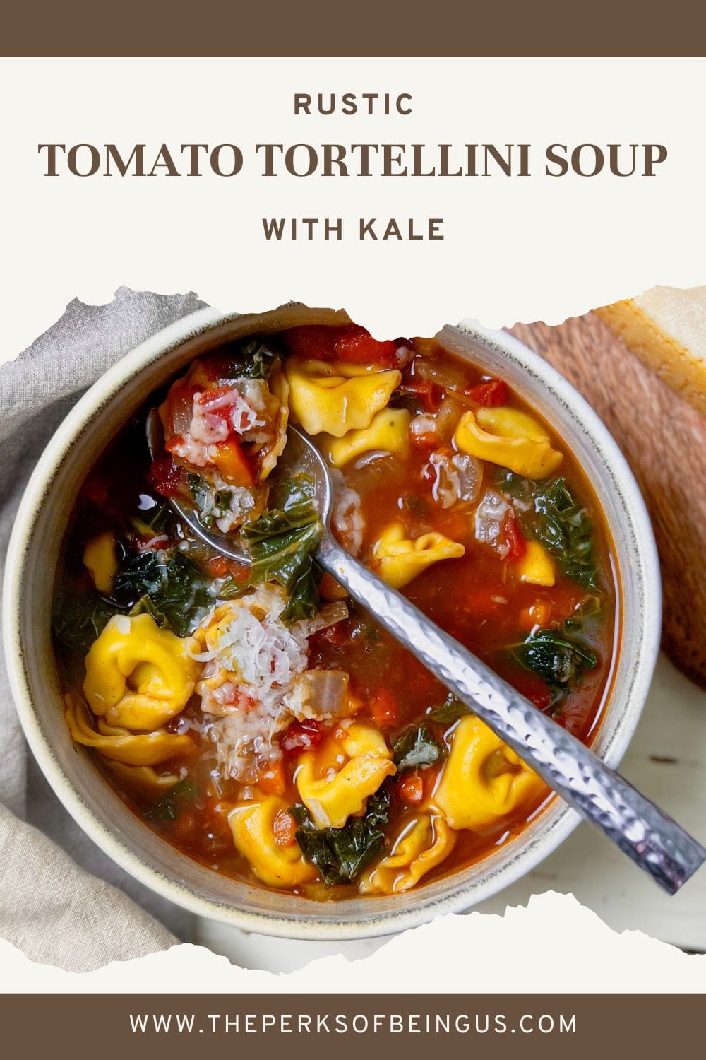 Tortellini tomato soup with kale in a bowl with a spoon